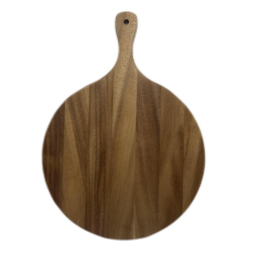 BEST ACACIA WOOD: Made of premium acacia wood, this cutting board is sturdy for daily use. 100% HEALTH: Hand carved from one Single Piece of Acacia wood by our craftsmen. Food safe, No glue, PVC or toxic finishes. GREAT SIZE: The thing your cutting doesn't fall off the edge, so this wooden cutting board is great for meat, pizza, bread, rolls,fruit, and cheese on a tray. HANDLE With HANGING HOLE: With long handle, hang is on my accent wall and take it down when you want to use it. Easy to clean and it looks great as a decor on your kitchen counter. 100% CUSTOMER SATISFACTORY: Your satisfaction is always our promise. Contact us, we offer 100% money back guarantee if you are dissatisfied with our cutting board.