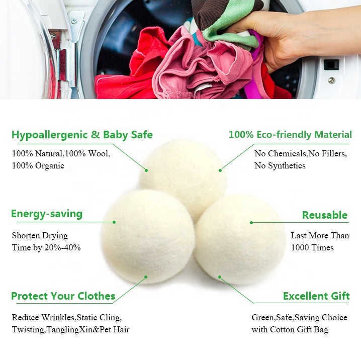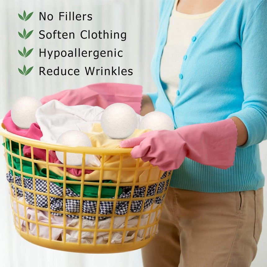 · SUPERIOR QUALITY WOOL – 100% premium wool with no synthetic fillers, rolled into tight, extra-large balls and felted for a natural, long lasting product. · REUSABLE FABRIC SOFTENER – Replace chemically infused dryer sheets and liquid fabric softeners with an eco-friendly and natural alternative that will last more than a thousand dryer loads. · SPEED UP DRYING TIME – As the dryer balls tumble around in the dryer, they lift and separate laundry allowing the hot air to circulate better and dry faster. · SAVE ENERGY COSTS – Reduce appliance usage and electricity bills by shortening drying time up to 25% · REDUCE STATIC CLING – Toss them into the dryer and your clothing will dry faster, fluffier and softer, with fewer wrinkles and less static cling.