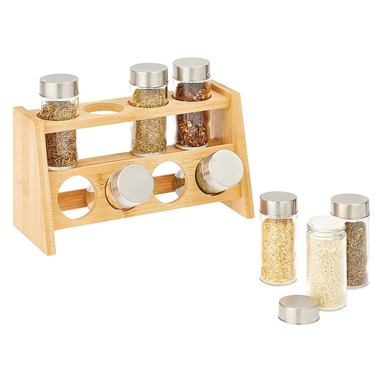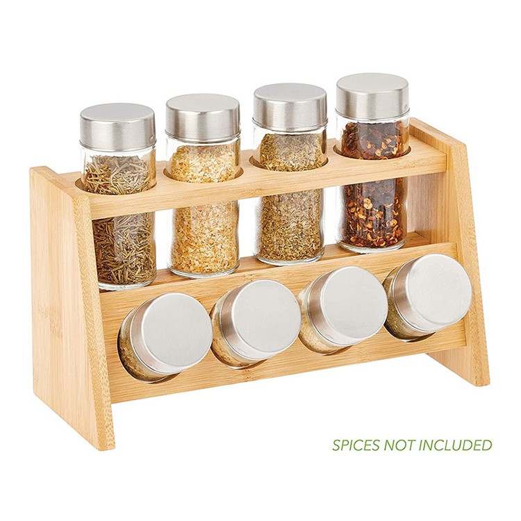 2-TIER STORAGE: The compact tiered design provides plenty of storage space; Use to store herbs, spices, curries, seeds, garlic salt, onion powder, cinnamon, baking supplies, and more; Perfect for organizing aspirin, vitamins, essential oils and other medicines used daily; STORAGE MADE SIMPLE: Create more space in cluttered kitchen cabinets, shelves and pantries with this very functional tiered shelf organizer; Items are within easy reach, but out of view, keeping your kitchen looking organized and clean; No hardware needed, it is easy to use FUNCTIONAL & VERSATILE: The 2-tiered and angled levels make it easy to locate and quickly grab what you need; Create extra space - use it throughout the home; Perfect for storing and organizing perfume, lotions, body sprays, makeup and other cosmetics in the bathroom; Works in office desk drawers for organizing supplies; In craft areas for paint or glitter bottles; Use in homes, condos, apartments, RVs and campers QUALITY CONSTRUCTION: Made from durable, sustainable eco-friendly bamboo; Add a natural touch and go green; Bamboo naturally resists stains, odors and bacteria and it is eco-friendly; Jars are made of glass with stainless steel lids Easy Care - clean by wiping with a damp cloth or using mild soap and water; Be sure to dry it completely after washing; Do not submerge the rack in water